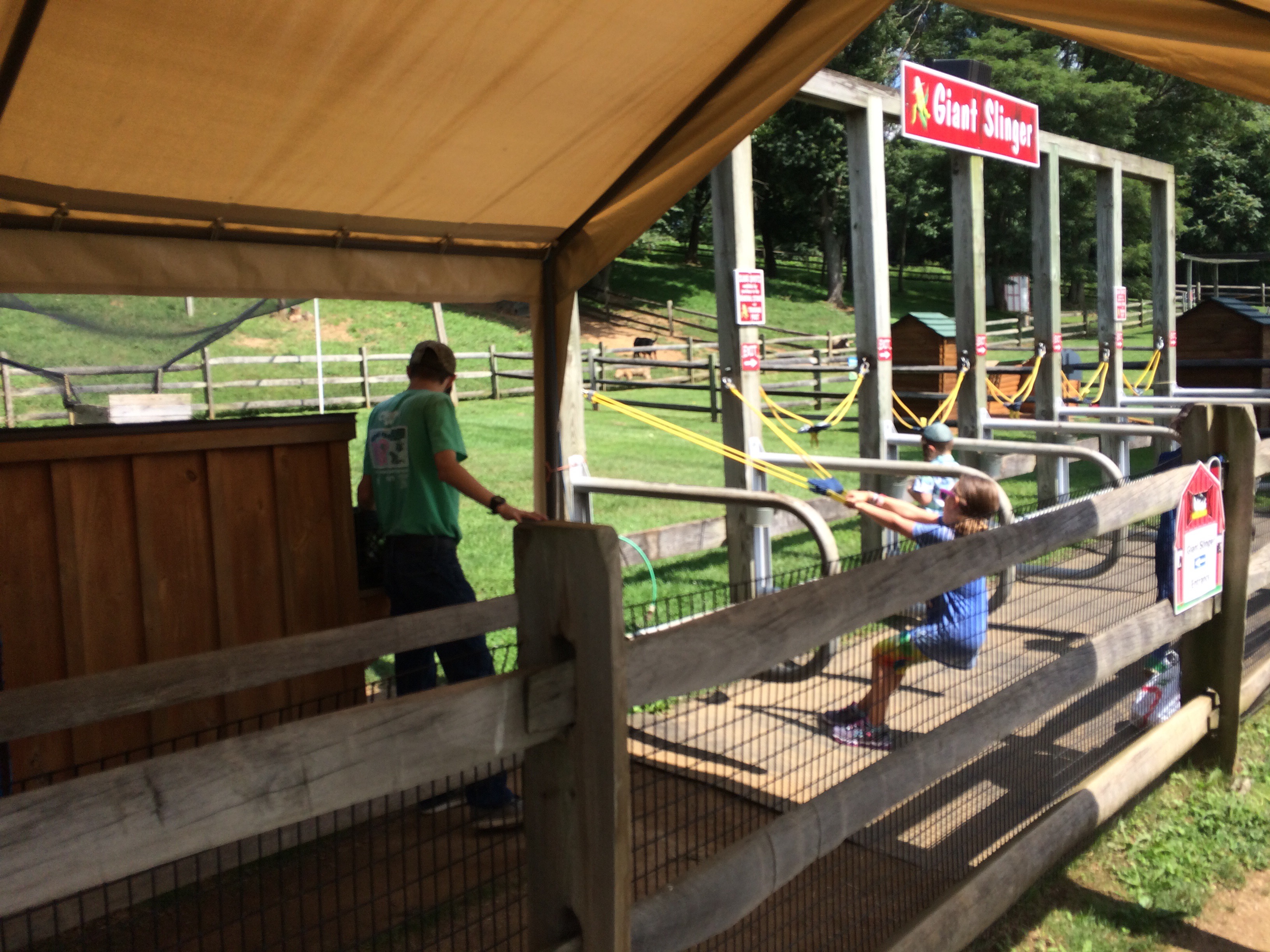 Next, my daughter tried the Giant Slinger. Now this is mean, but my favorite part was the power of the sling shot’s backfire shooting her onto her tush in a very surprising situation. She was not as amused as I was…